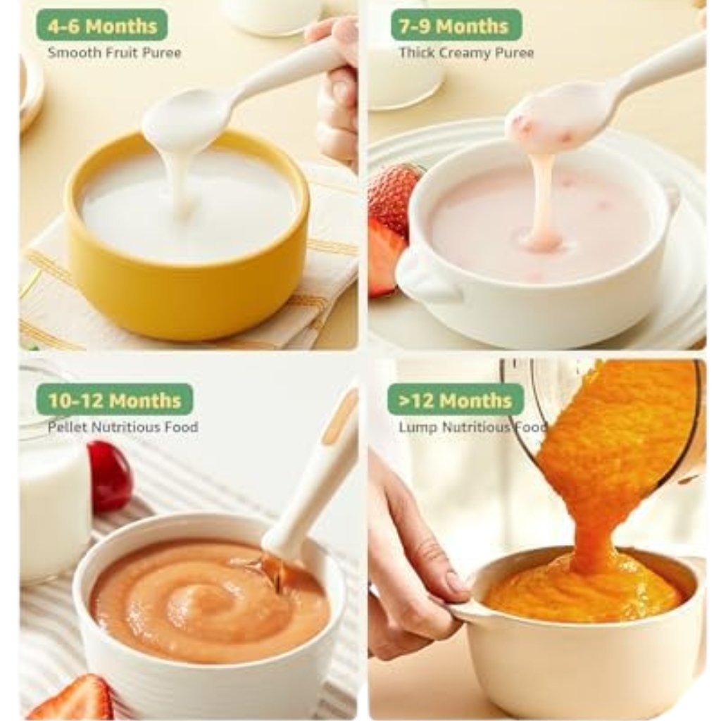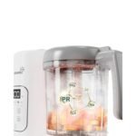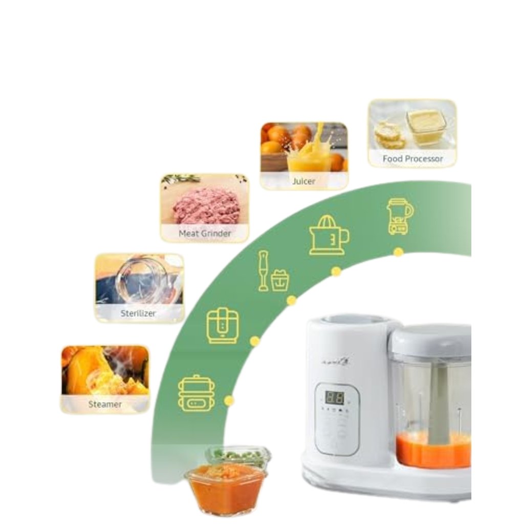All-in-one baby food processor designed to steam ingredients and blend into puree textures for infant feeding.